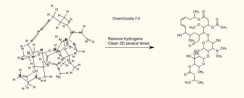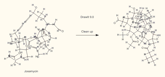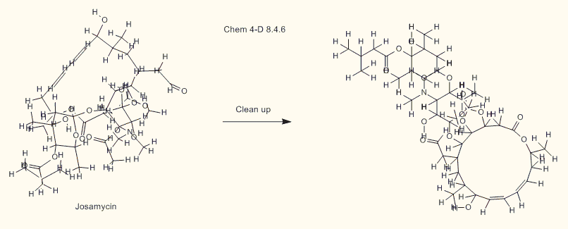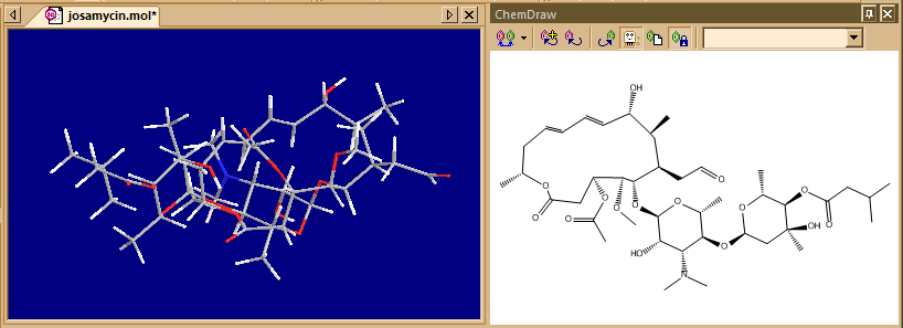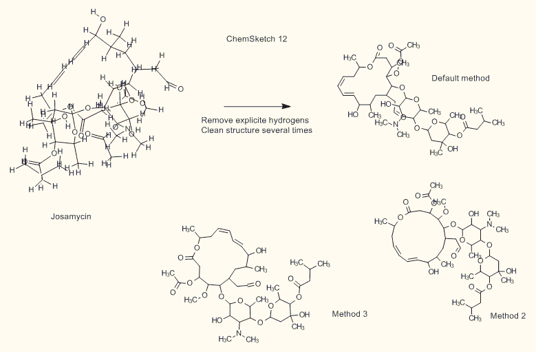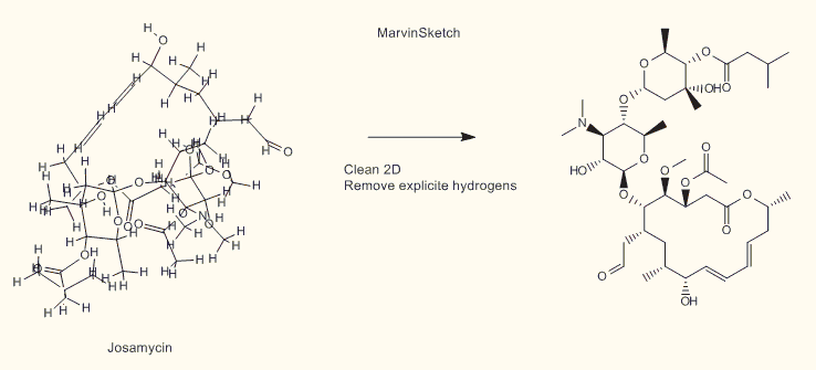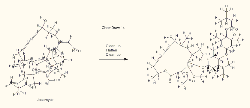 A 3D kémiai szerkezeteknek szokványos rajzzá való automatikus visszaalakítása mindig problematikus volt. Általában csak kis és többé-kevésbé merev molekulák esetén kaphatunk elfogadható eredményt. A jozamicin nevű makrolid antibiotikum 3D molekula fájljával tettünk próbát. Csak a programokban elérhető opciókat használtuk, némelyiket többször is. Az eredmények:
