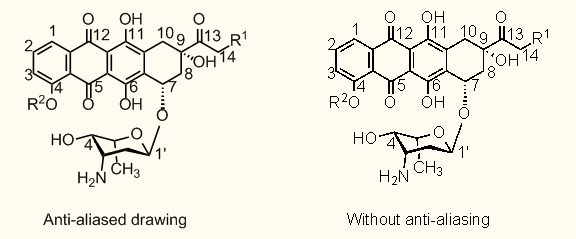 A legfejlettebb a ChemBioDraw megoldása, itt élsimítás opcionálisan ki/be kapcsolható exportnál vagy a képernyőn. A ChemSketch csak a képernyőn használja (áthidalható képernyő mentéssel, ha képfájlokra van szükségünk). Az Accelrys Draw esetén nem kapcsolható ki, ami amiatt kellemetlen, hogy a Windows vágólapon keresztüli exportnál utólag nem minden objektumnál látszik az élsimítás.