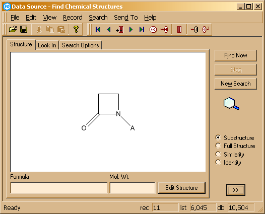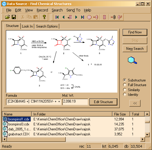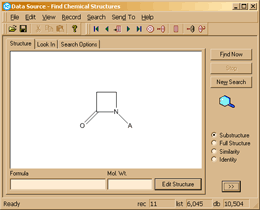 Az adatbázisokkal való kapcsolattartásban használják a kémiai szerkezetek Smiles, SLN vagy InChi karakterformátumú (sztring) kódolását, amelyet ChemSketch, ChemBioDraw, Accelrys Draws, DrawIt, ChemDoodle és MarvinSketch támogat. Ha egy ilyen fájlt egy szövegszerkesztőben megnyitunk, valami ilyesmit látunk: