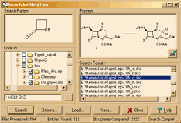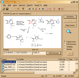 A ChemSketch, ChemBioDraw és ChemDoodle gyorskeresőt tartalmaz. Az első kettőben ez nincs benne a programok alap ill. ingyenes verziójában, mivel szükséges hozzá a keresőmodul vagy társprogram megléte is. A ChemSketch esetén ez a Search for structure névre hallgat s gyorsan meg lehet vele találni egy adott szerkezetet tartalmazó régebbi rajzot. A megadott kereső szerkezet szerint lehet az egy vagy több különböző könyvtárban levő fájlokból válogatni (pontos vagy szubstruktúra kereséssel SK2, MDL MOL, SDF, SKC, CHM, CDX, RXN formátumú fájlokból, valamint World, Excel, Powerpoint és PDF dokumentumokból). A ChemOffice családban a ChemFinder for Office egy hasonló, de önálló alkalmazás, amely molekula és rajzfájlokban valamint MS Office programokba ültetett rajzokban keres a megadott kereső struktúra alapján. A talált rajzot meg lehet nyitni szerkesztésre vagy egy másik dokumentumba átvinni. A ChemFinder for Office azonban lassabb, kevésbé jól sikerült az előzőnél, a 11 és 12-es verzióban például pontosan ugyanazokat a fájlokat és opciókat használva nem egyforma a keresés végeredménye. A ChemDoodle a támogatott molekula és rajzfájlokban talált szerkezeteket megmutatja és szintén meg lehet nyitni azokat a saját szerkesztőjében.