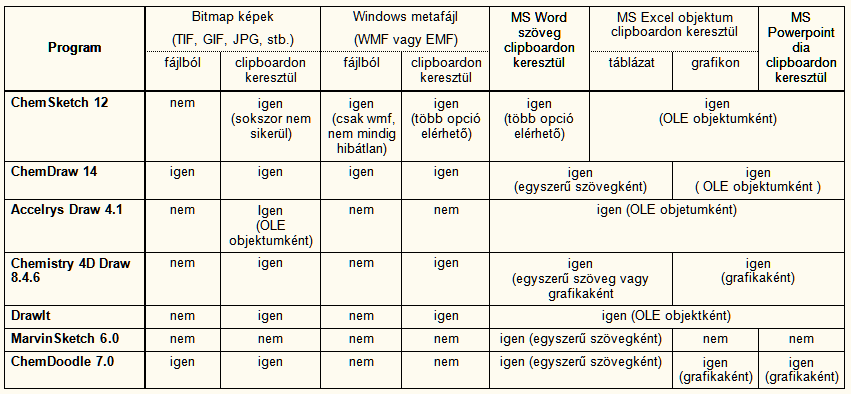 Ez leginkább csak a ChemBioDraw, ChemDoodle, ChemSketch és DrawIt esetén fontos, mivel ezek a programok alkalmasak poszterek készítésére és ezekben a kémia mellett több más adattípus is előfordulhat. Ha vonalas rajzokat, grafikonokat, diagrammokat kell egy másik programból importálni, a bitmap képek (JPG, TIF, GIF, stb.) helyett használjunk vektor formátumot (Windows metafájl WMF vagy EMF, SVG, PDF). Az előbbiek ugyanis nem méretezhetők jelentős minőségromlás nélkül. Az újabb verziókban az SVG vektorformátum is támogatott. Ugyanez érvényes, ha nem valódi fájlokat exportálunk, hanem objektumokat a Windows vágólapon keresztül. Az alábbi táblázat összefoglalóan bemutatja, hogy az egyes fájl és clipboard formátumok (objektumok) hogyan importálhatók.